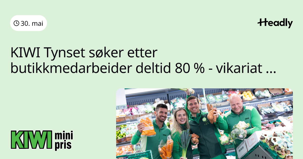 KIWI Tynset søker etter butikkmedarbeider deltid 80 % - vikariat til 2.9.2026